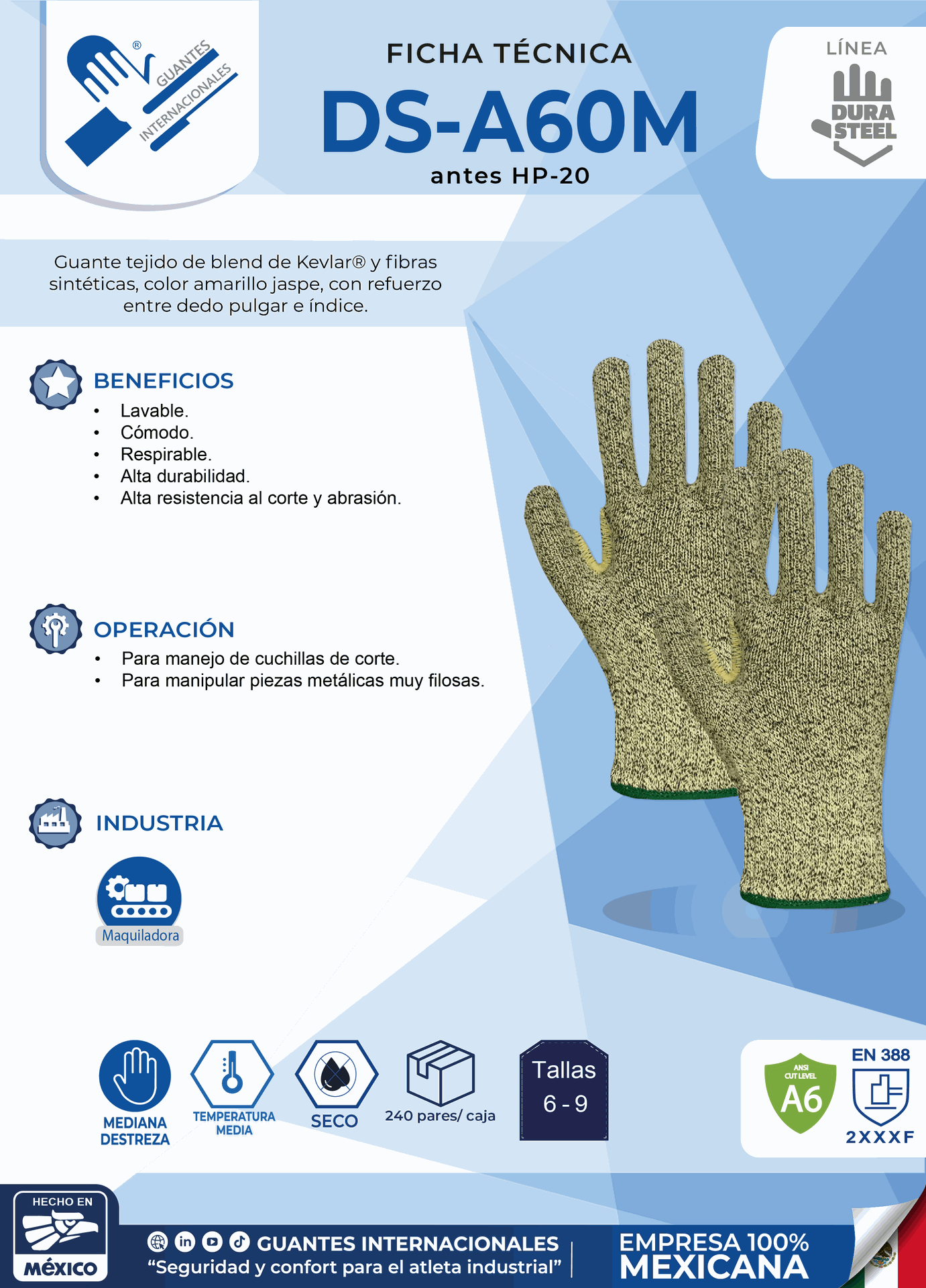 Guante Resistente al Corte Kevlar Amarillo T-6 GUANTES INTERNACIONALES HP-20